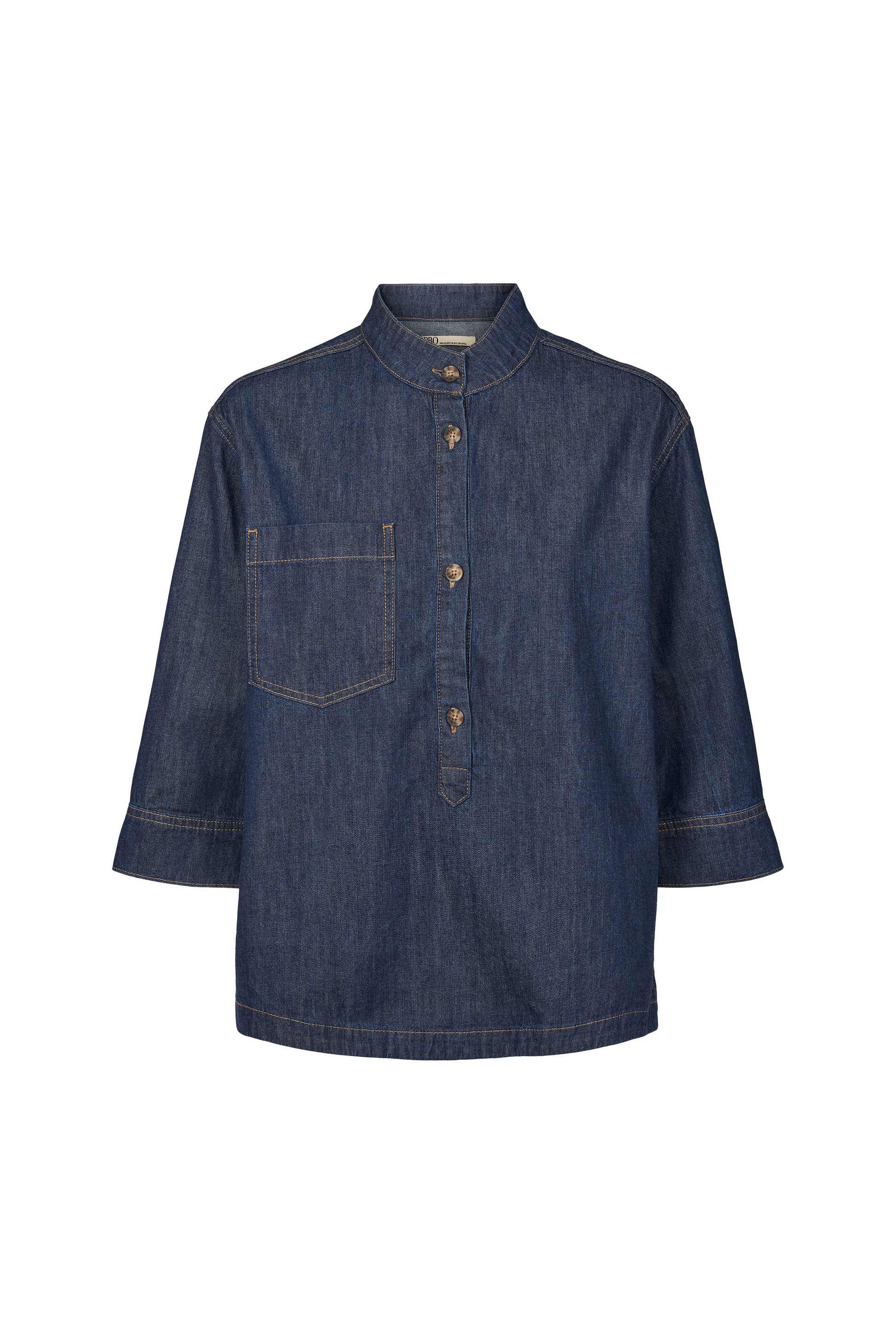 Essence shirt fra PBO er en lækker denim bluse i 100% bomuld. Blusen har drop skulder, halv stolpelukning foran og en løs pasform. Den passer perfekt til bukserne Melli pants også fra PBO. Blusen kan også styles alene til fløjlsbukser, lærredsbukser eller nederdele. Brug den på kolde dage med en langærmet t-shirt under.