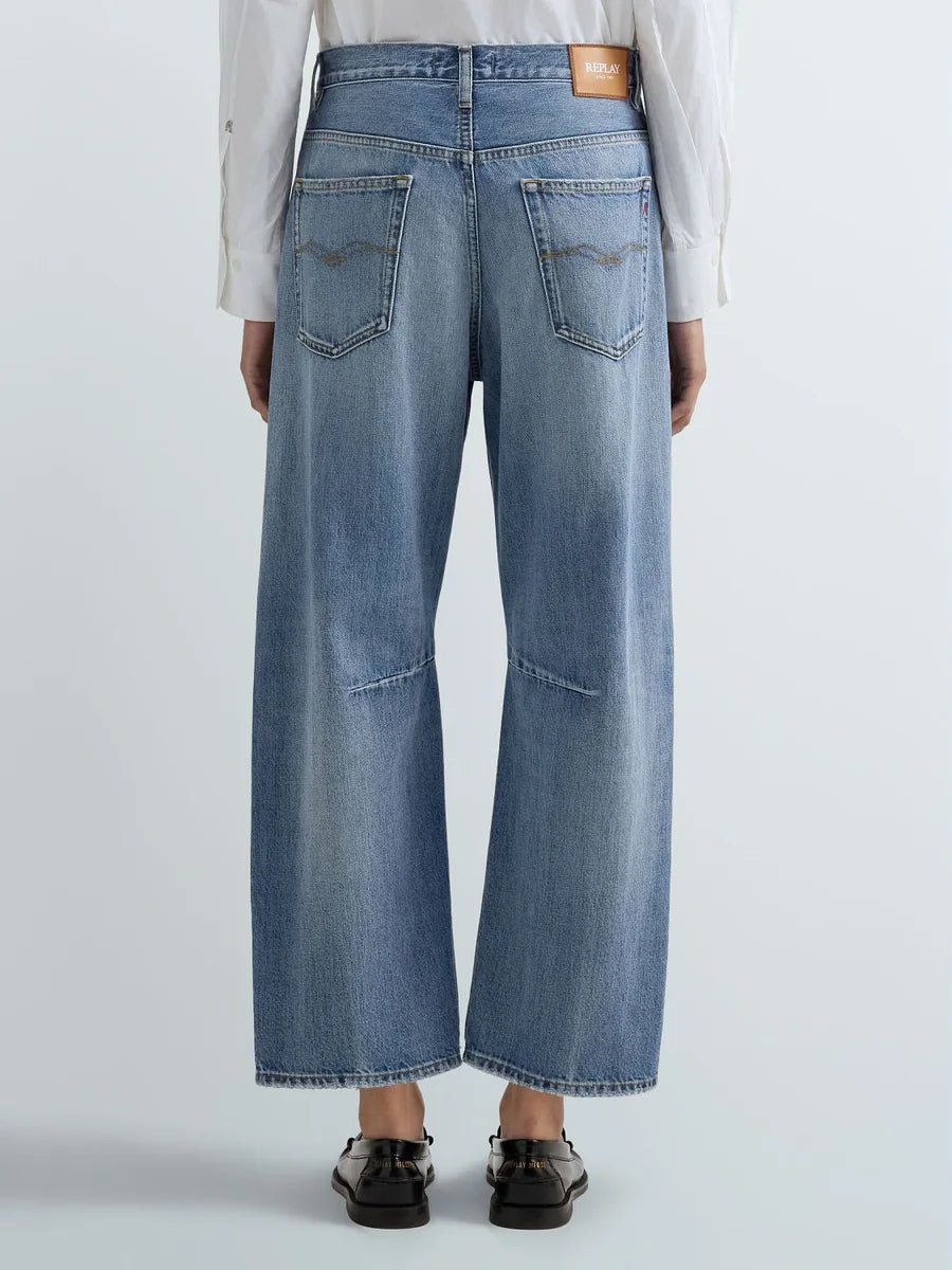 Cool capri jeans fra Replay. Light blue wash, med let slid. Bukserne har let barrel facon med indsyning ved knæene. Brug dem med loafers, eller andre åbne sko, for et et let udtryk, eller med en støvle og strik indtil vejret indbyder til bare tær.