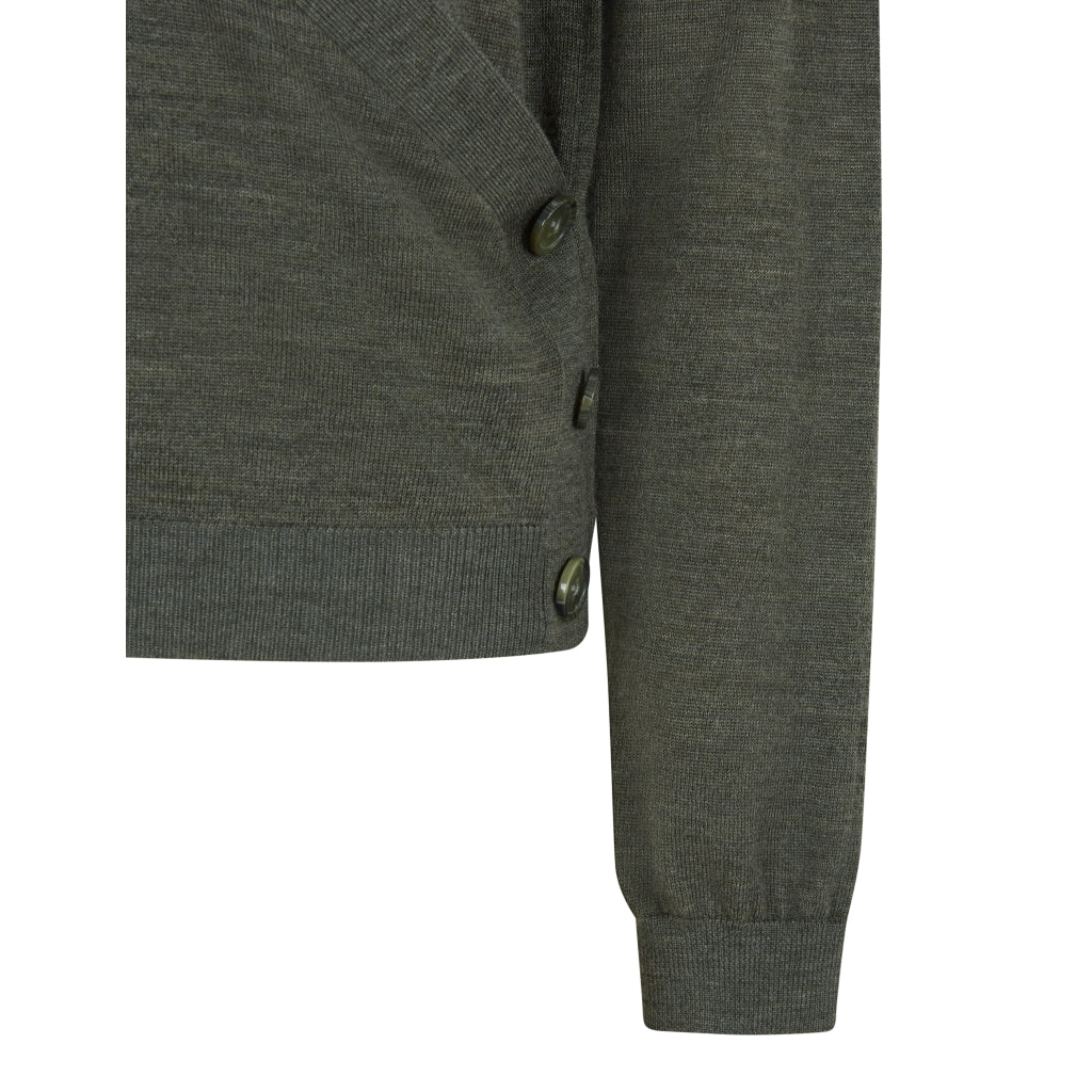 Toppen har en fast slå-om effekt, der fremhæver taljen på flatterende vis, og fine pynteknapper i den ene side, som giver et eksklusivt touch. Farven Forest Night tilfører dybde og ro til garderoben – et ideelt valg til både hverdag og kontor.