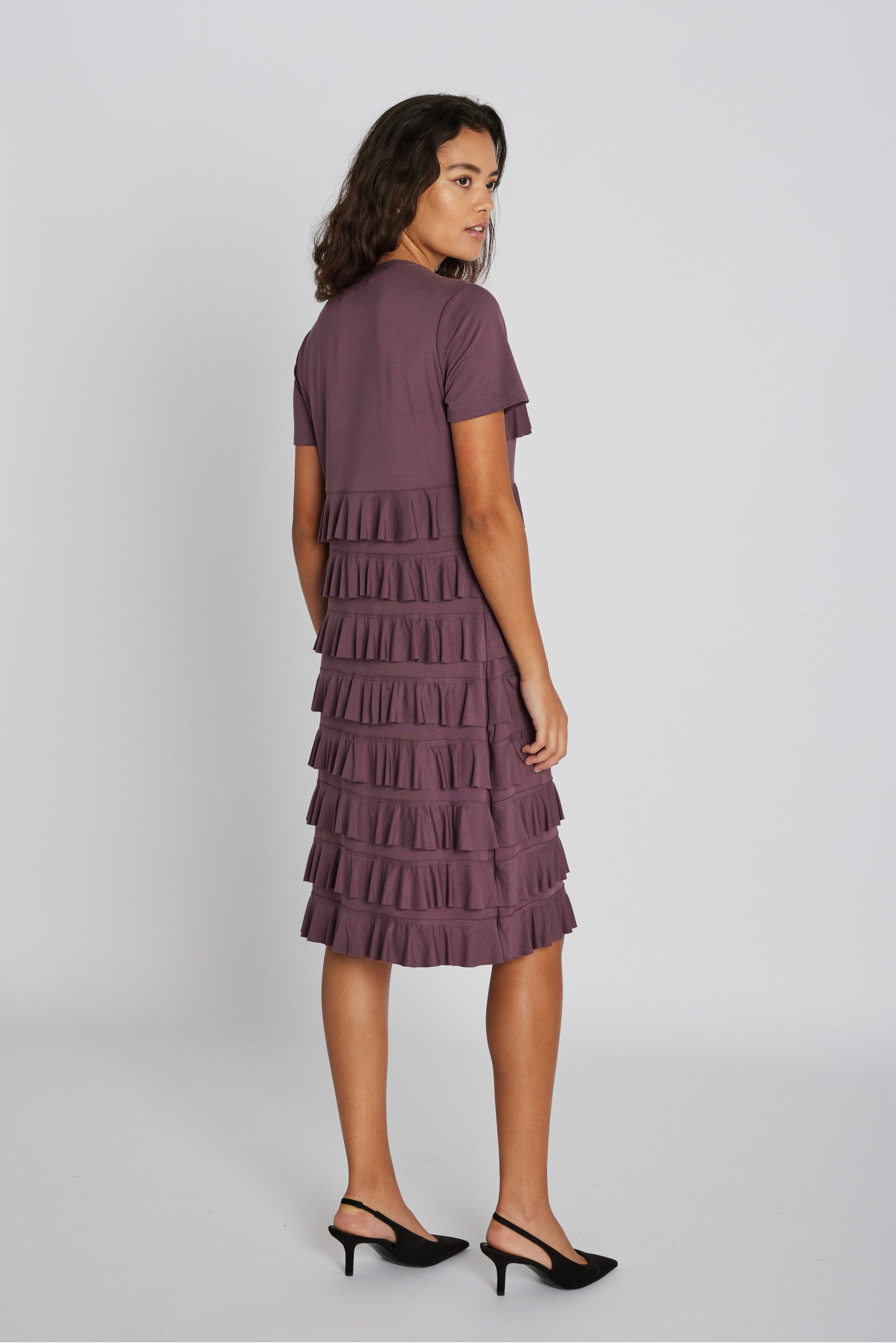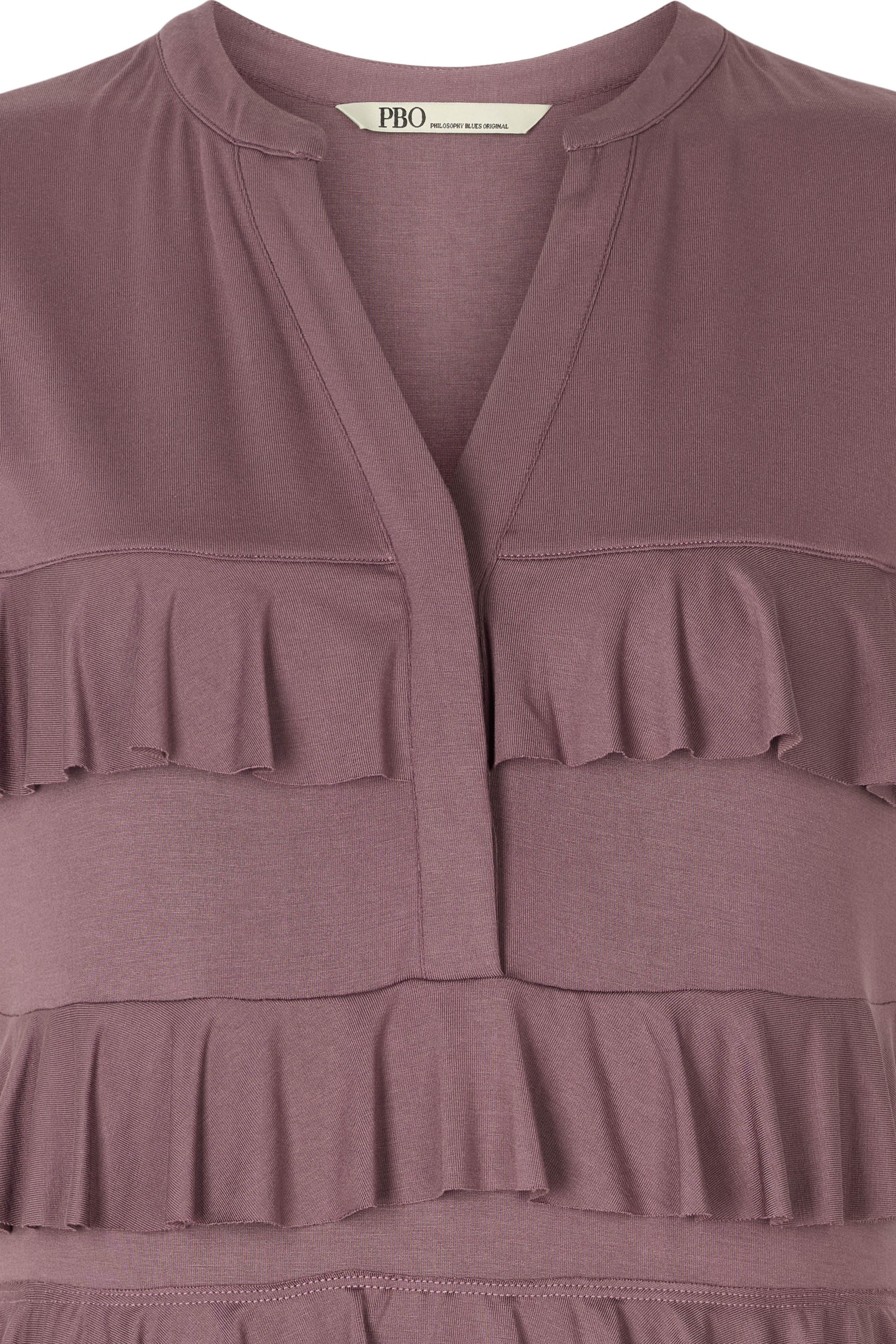 En ægte klassiker fra PBO, deres Jolaf dress. Kjolen er i en skøn jersey kvalitet og med et enkelt snit, der klæder de fleste pga de mange frynser. Kjolen har kort ærme og lille v ved hals udskæringen. Den er knælang og gennemforet, så den falder naturligt flot om kroppen, ud at efterlade afsløringer.