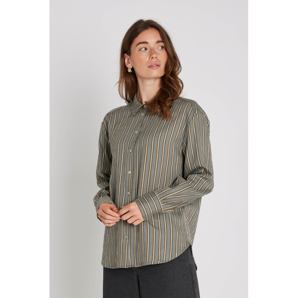 Lizzy Shirt fra PBO er en smuk skjorte i khaki-stribet design, fremstillet i en eksklusiv lyocell-blanding, der sikrer et let og behageligt fald. Den klassiske pasform og de diskrete striber giver et stilrent udtryk, perfekt til både kontor og hverdagsbrug.