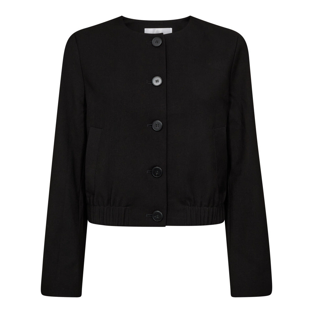 Cool kort bomber jakke, med rund hals og skrålommer. Jakken lukkes foran med knapper. Den har elastik i taljen og små skulderpuder, som giver den et ekstra flot udtryk. Brug den som overgangs jakke, eller som alternativ til din blazer. Kan dresses både op og ned til forskellige lejligheder.