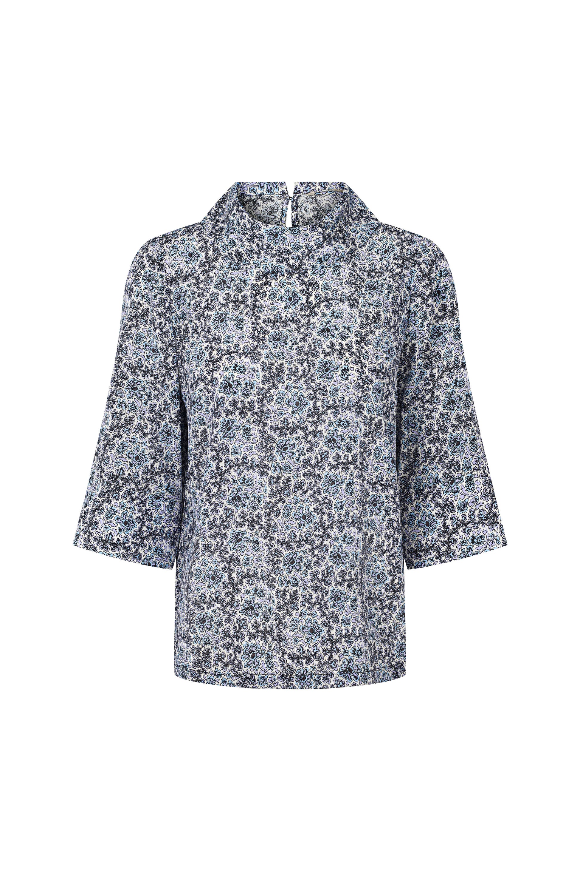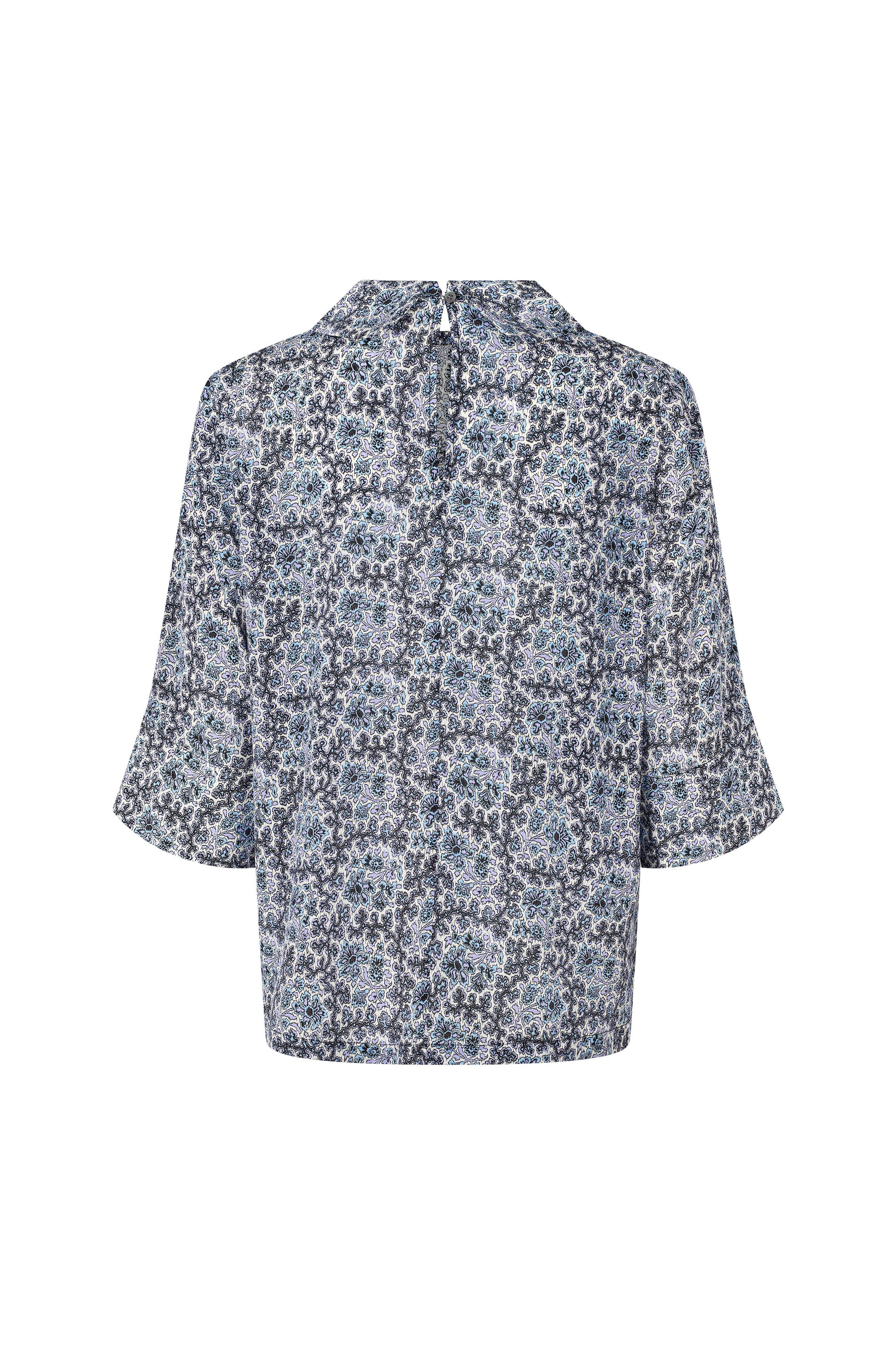 Smuk silke bluse med print. Blusen har en flot krave foran der falder let og lukkes bagtil. Brug den til dine jeans for et lækkert eksklusivt look eller til dine suitpants for et formelt udtryk.