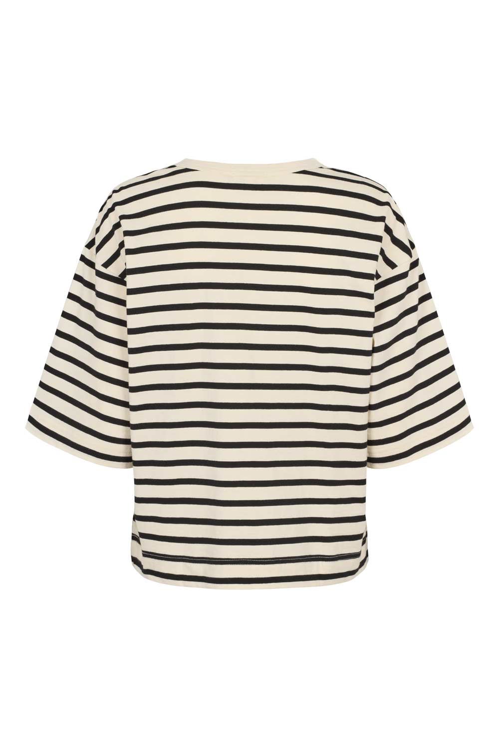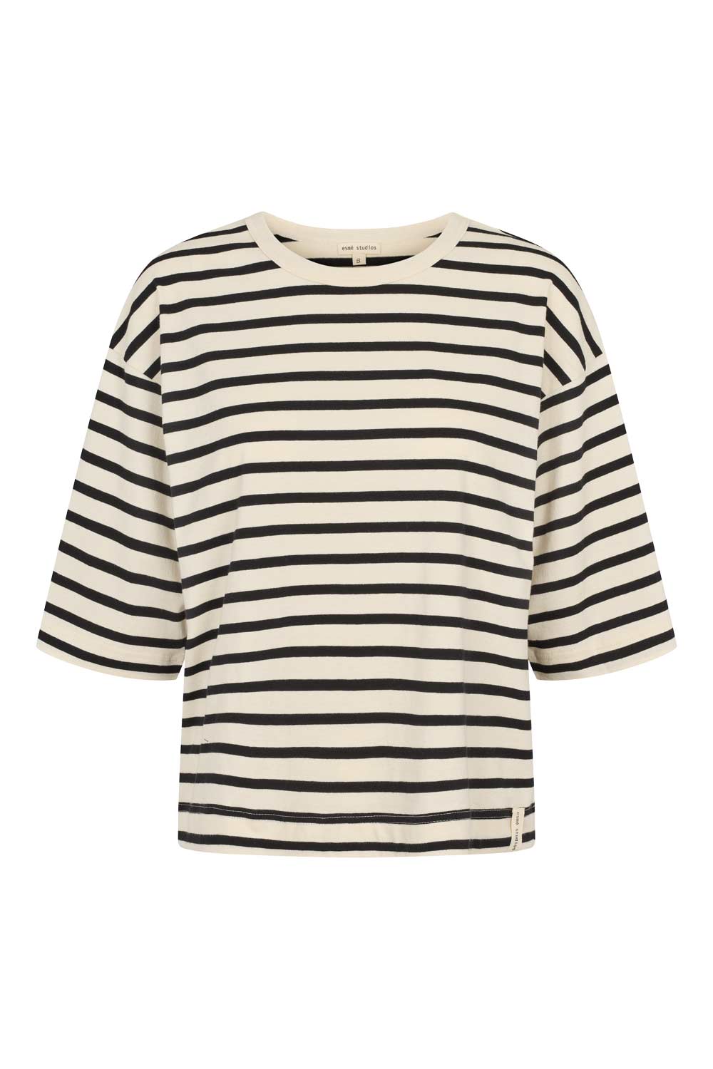En klassiker fra esmé studios. Og striber man aldrig går fejl af. Boxy t-shirt med 3/4 ærme og masser af luft i creme med sort stribe. En god t-shirt der hurtig bliver en favorit.